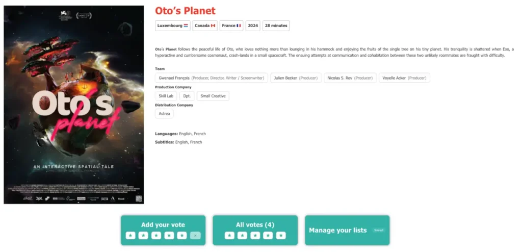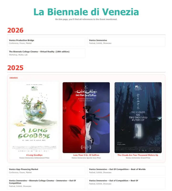 Each event now has a dedicated descriptive page (see example), allowing the platform to document festivals, markets, showcases, labs, exhibitions and professional gatherings with more consistency. These pages are designed to connect events with related works, selections, companies and editorial coverage over time.