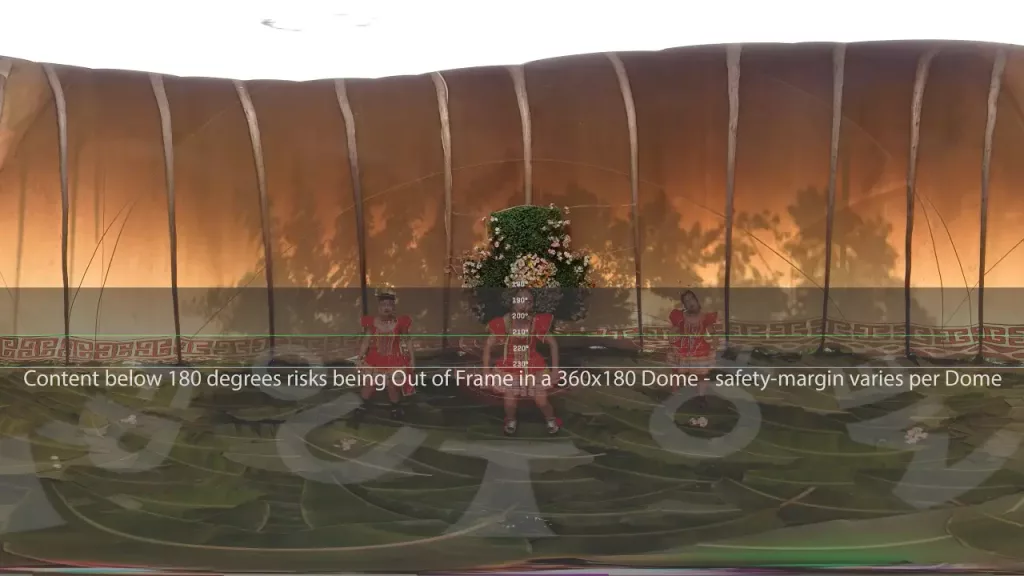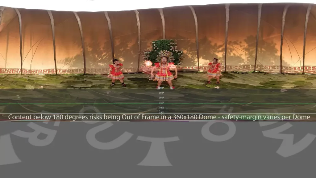 C.V. – There was a lot of redesigning the image. It was not like we have a sphere and we cut it in half, and that’s the half you see, because we had some action going on in that lower part of the sphere. Avinash taught us some of the workflows that he had already created for converting 360 to 180 and this included compressing the image, not just compressing the size, but compressing the pixels. So if we have a sphere, we can compress a lot of the sky into itself in order to get more of the lower, below half of the film into the upper half of the projection. For instance, because we compressed the sky into itself, now we can see the shoes of the performers. But if you compress a part of the sky and then suddenly one of the performers raises a hand, then the hand completely disappears because it was compressed. So we had to create a lot of masks for the first and last scenes, which was 360 video.